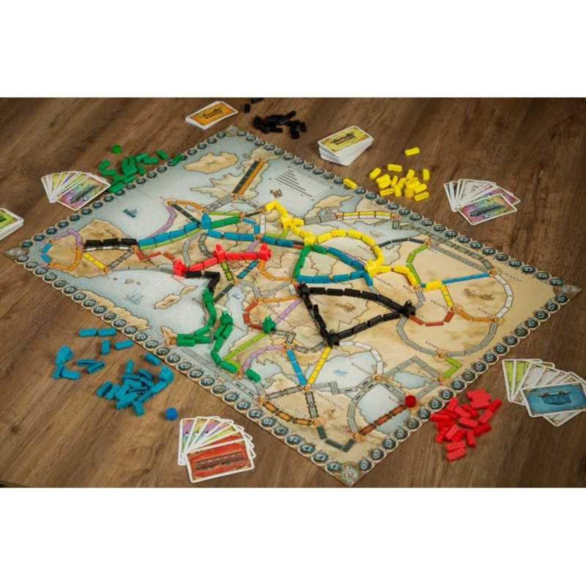 Más que un mapa nuevo, Ticket to Ride: Europa presenta elementos de juego completamente nuevos. Los túneles pueden requerir que pague tarjetas adicionales para construir sobre ellos, los ferries requieren tarjetas de locomotora para reclamarlos, y las estaciones le permiten sacrificar algunos puntos para usar la ruta de un oponente para conectar la suya. El juego también incluye tarjetas de formato más grande y piezas del juego Train Station.